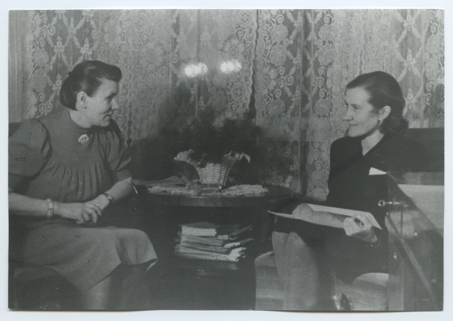 Tartu ülikooli raamatukogunduse ja bibliograafia kateedri juhataja Helene Johani (vasakul) ja assistent Kaja Noodla laua ääres vestlemas 1948. a.