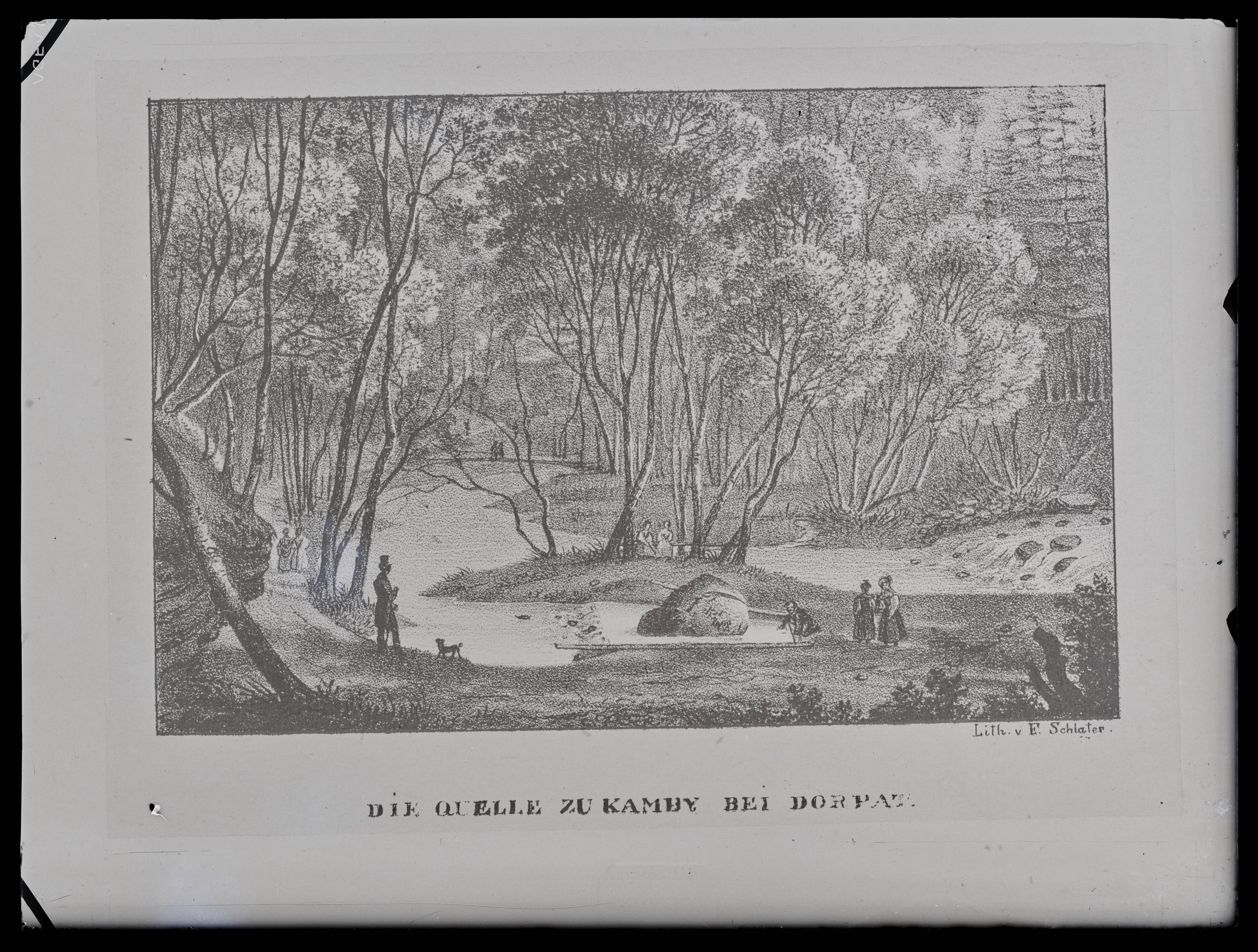 Tekst negatiivi ümbrikul: Schlater. Kambja allikas. II 8 Die Quelle zu Kamby bei Dorpat. Ansichten von Dorpat ... 1833