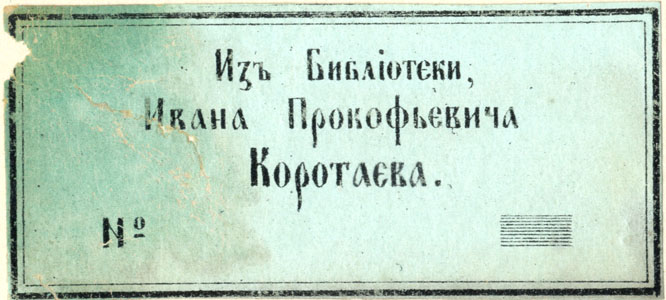 Nelinurkses mustas ornamenteeritud raamistuses: Изъ Библiотеки / Ивана Прокофьевича / Коротаева. / №