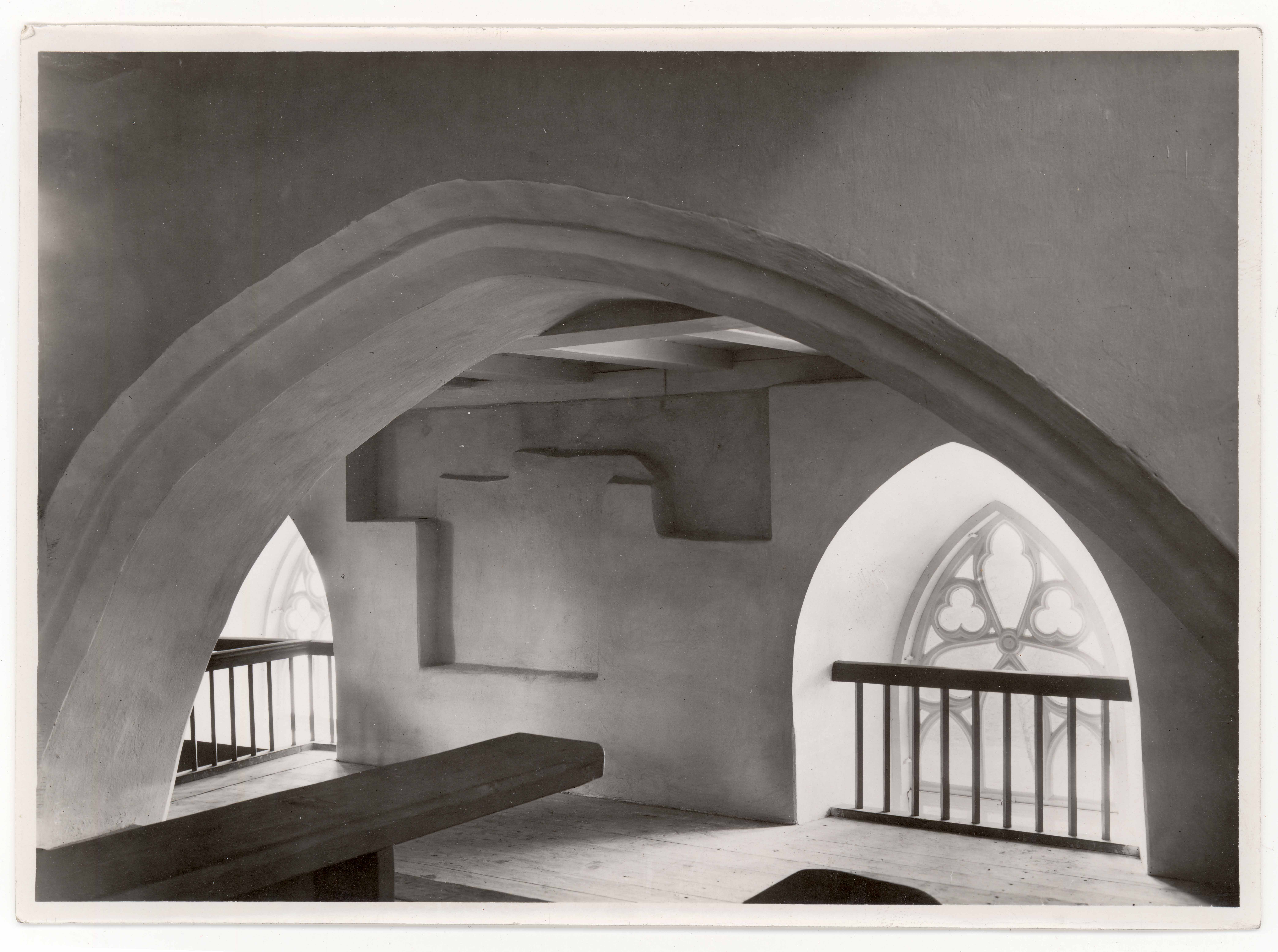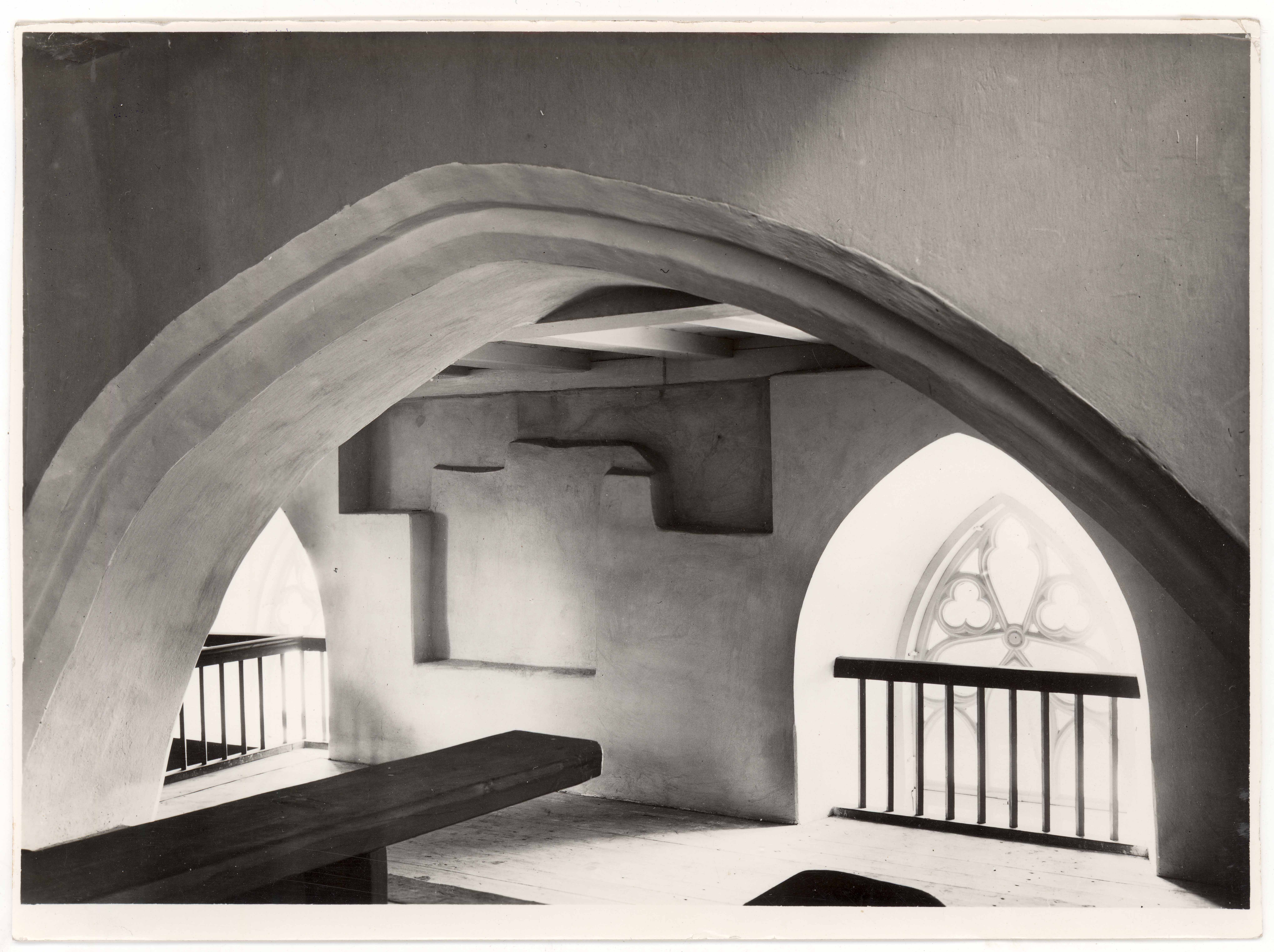 Urvaste kiriku pikihoone orelirõdul vaade S-seinas säilinud keskaegsele ehituskehandile