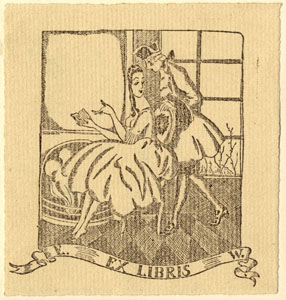 Kamina ees istuv naine raamatuga, tema selja taga seisev mees. Joonises all vasakul lindil: E. all paremal: W. all keskel: EX LIBRIS
