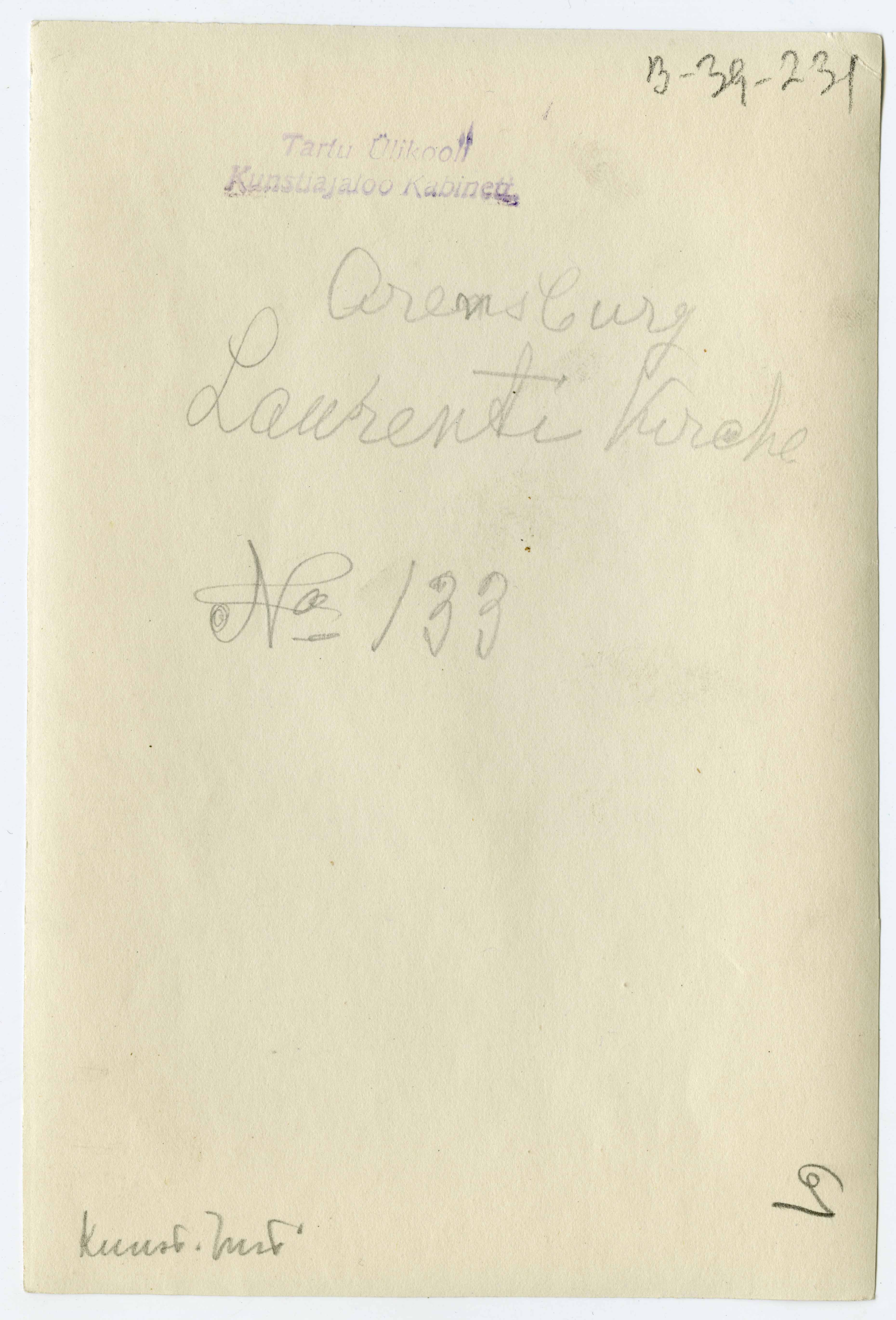 | dc.description | Tekst foto tagaküljel: Arensburg Laurentie Kirche. No 133. Kunst. Inst. Tempel: Kabinett | et |