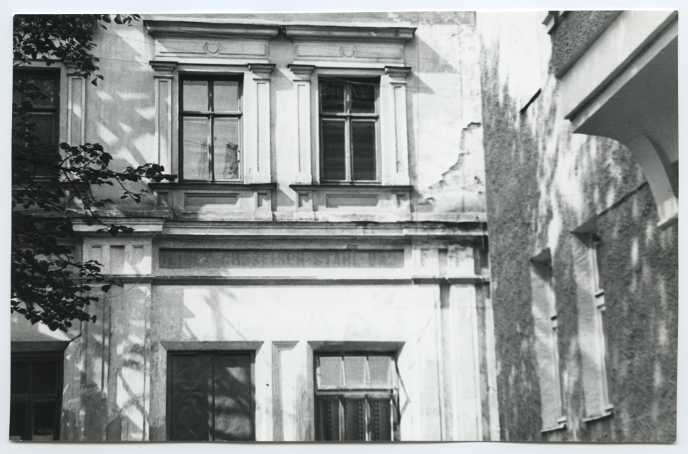 Tartu. Ülikooli tn. 10 hoone fassaad, kus on nähtavale tulnud vana saksakeelne kauplusesilt