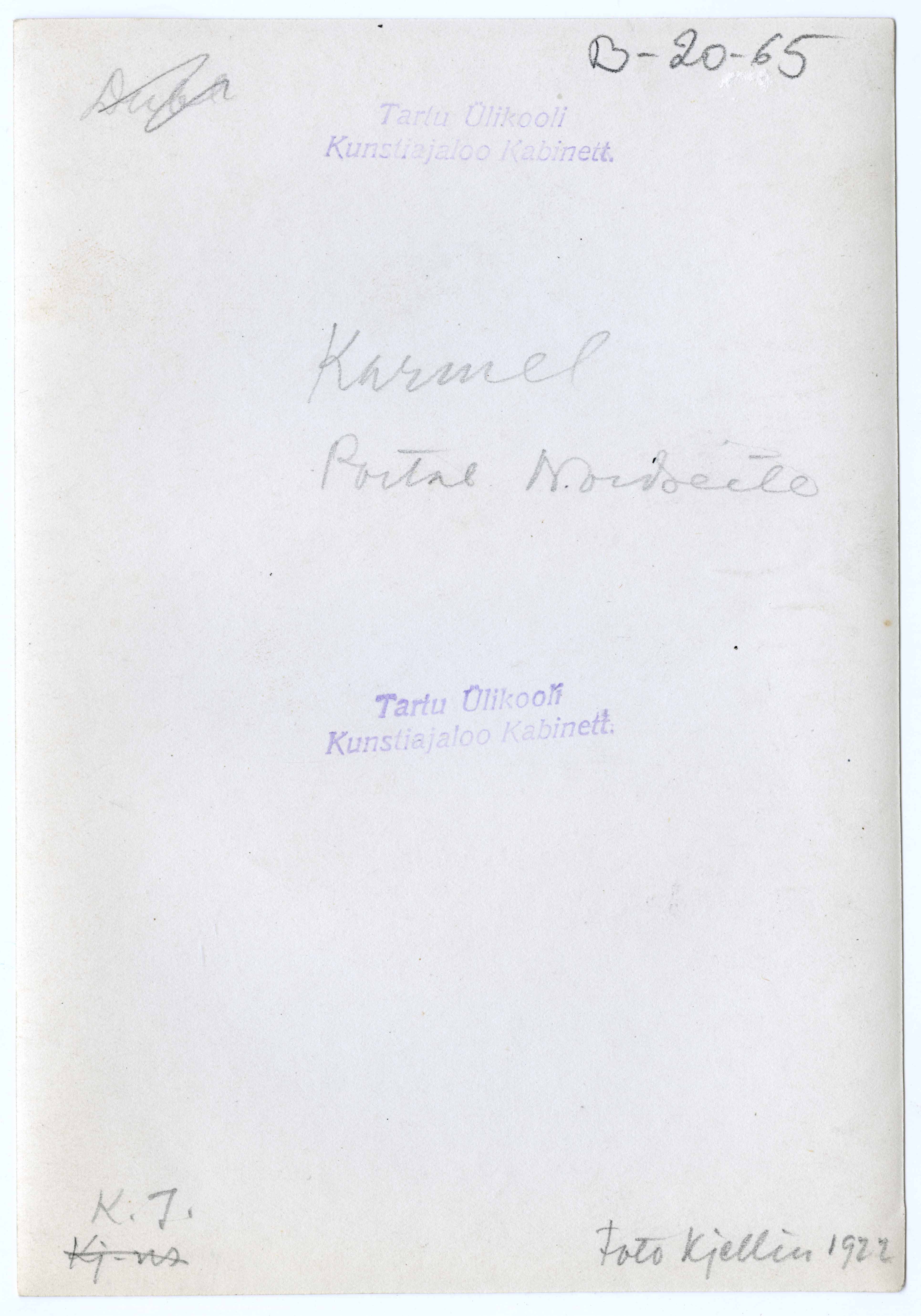 | dc.description | Tekst foto tagaküljel: Karmel. Portal Nordseite. Kunst. Inst. Foto Kjellin 1922. Tempel: Kabinett | et |