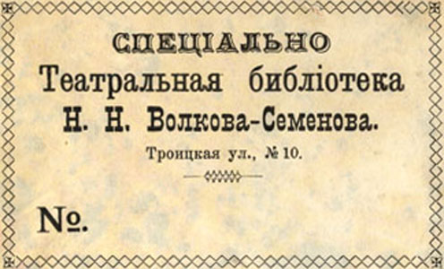 Nelinurkses raamis: СПЕЦIАЛЬНО / Театральнаая библіотека / Н. Н. Волкова-Семенова. / Троицкая ул., № 10 all vasakul: №