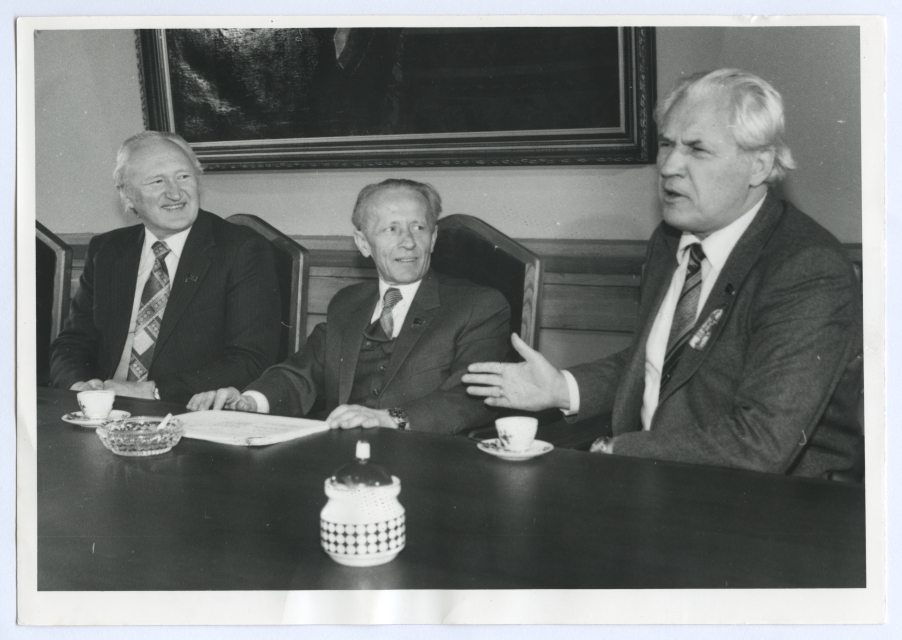Läti ülikooli rektor Visvaris Millers (vasakult), Vilniuse ülikooli rektor Jonas Kubilius ja Tartu ülikooli rektor Arnold Koop (kõnelemas) lepingu allkirjastamisel Tartus 20. mail 1982