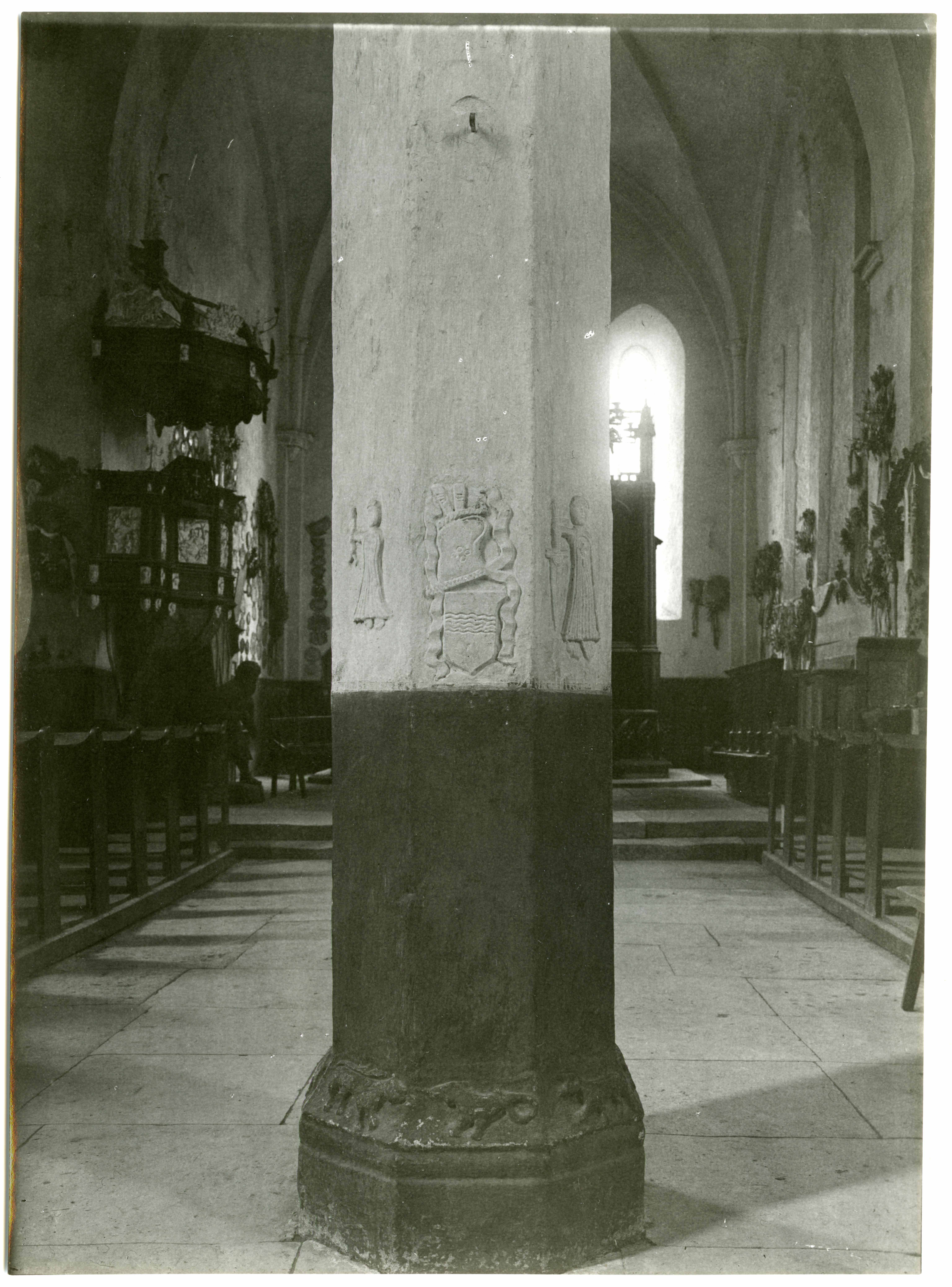 Kaarma Peetri ja Pauli kirik. Oktagonaalne raidreljeefidega keskpiilar. Tüvesel vapid