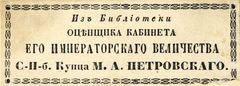 | dc.description | Nelinurkses ornamenteeritud raamistuses: Изъ Библiотеки / ОЦѢНЩИКА КАБИНЕТА / ЕГО ИМПЕРАТОРСКАГО ВЕЛИЧЕСТВА / С-П-б. Купца М. А. ПНТРОВСКАГО. | |