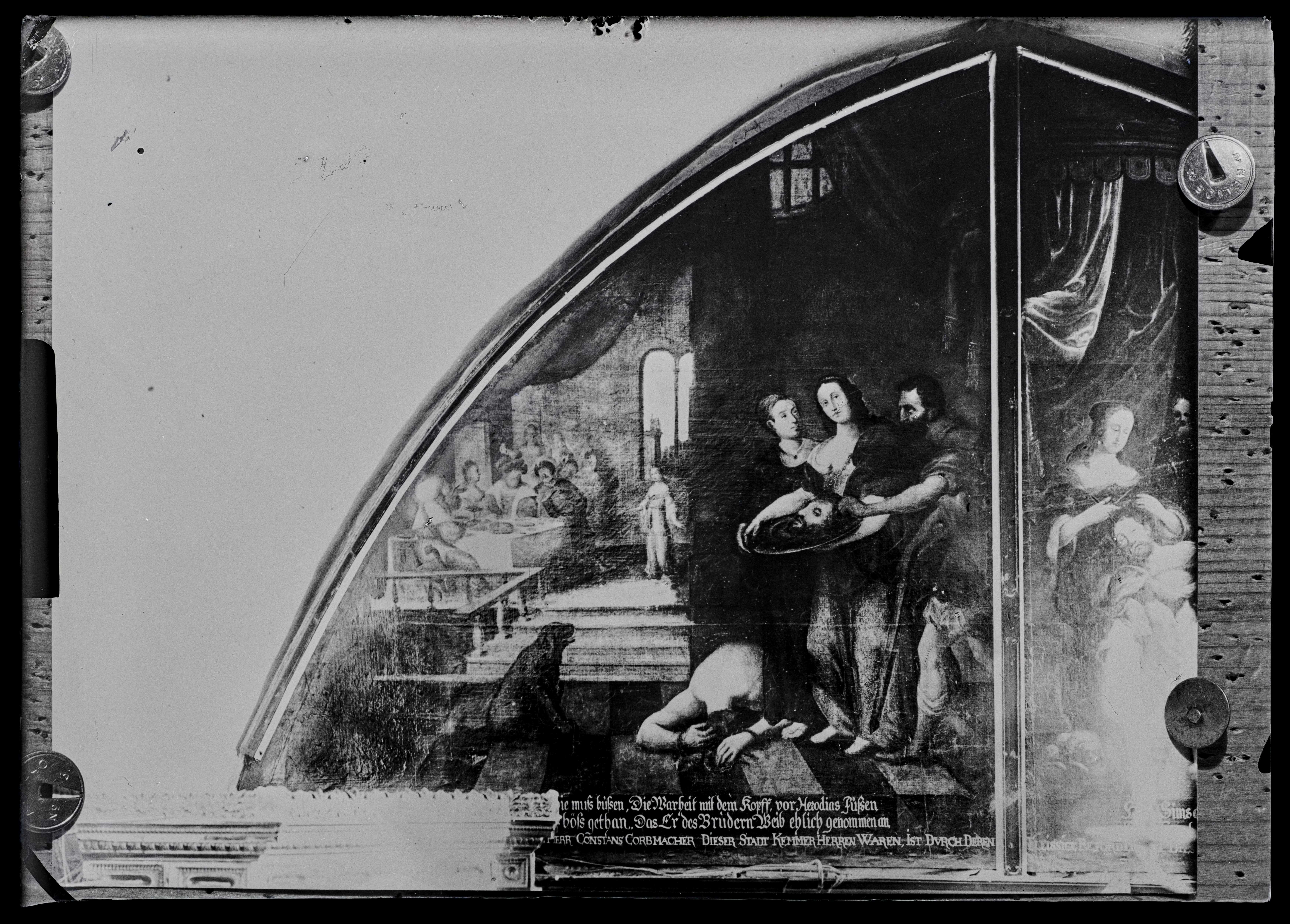 Tallinn. All-linn. Raekoda. Vasakpoolne lünetimaal Raesaali lääneseina lõunapoolses võlvikus. "Herodias Ristija Johannese peaga". Johannes Aken. 1667.