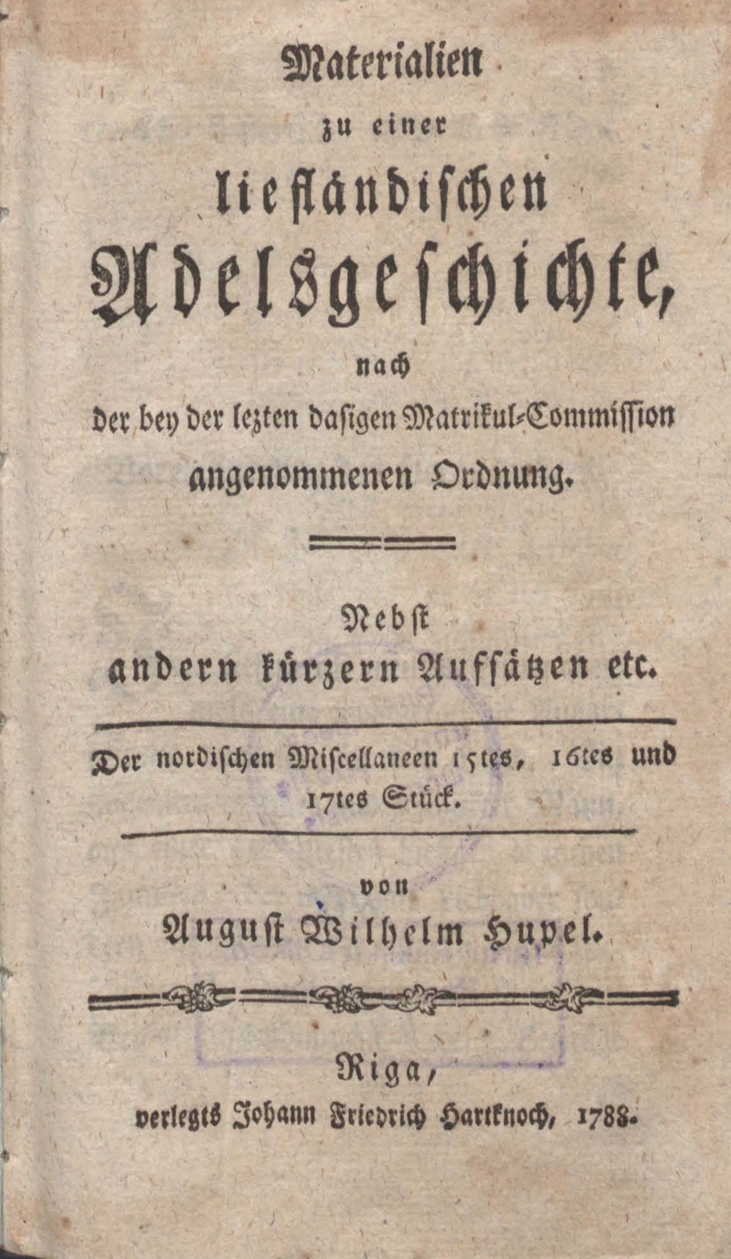| dc.title.alternative | Materialien zu einer liefländischen Adelsgeschichte nach der bey der letzten dasigen Matrikul-Commission angenommenen Ordnung | |