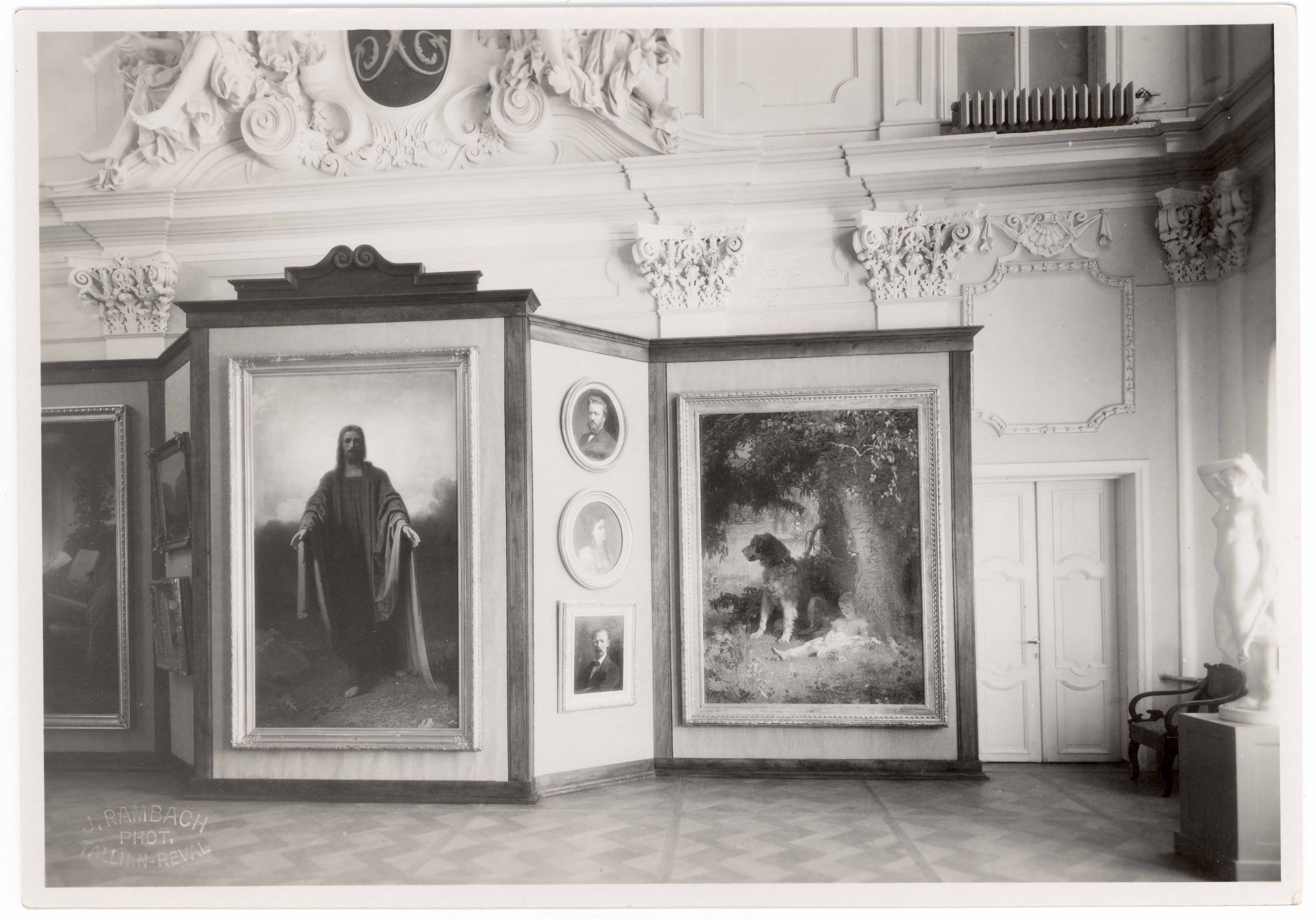 Tallinn. Kadrioru lossi (Niccolo Michetti, 1718-1725) peosaal. Eesti kunstimuuseumi ekspositsioon: suureformaadilised maalid. Vaade NO-seina.