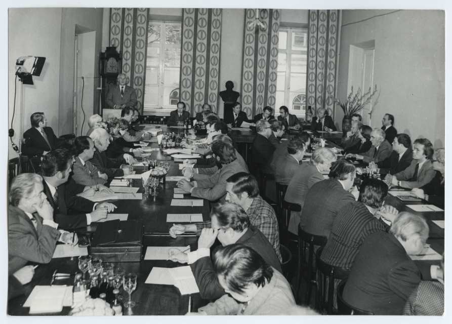 Tartu ülikooli 350. aastapäeva vabariikliku komisjoni esimene istung ülikooli nõukogu saalis 1980. a.