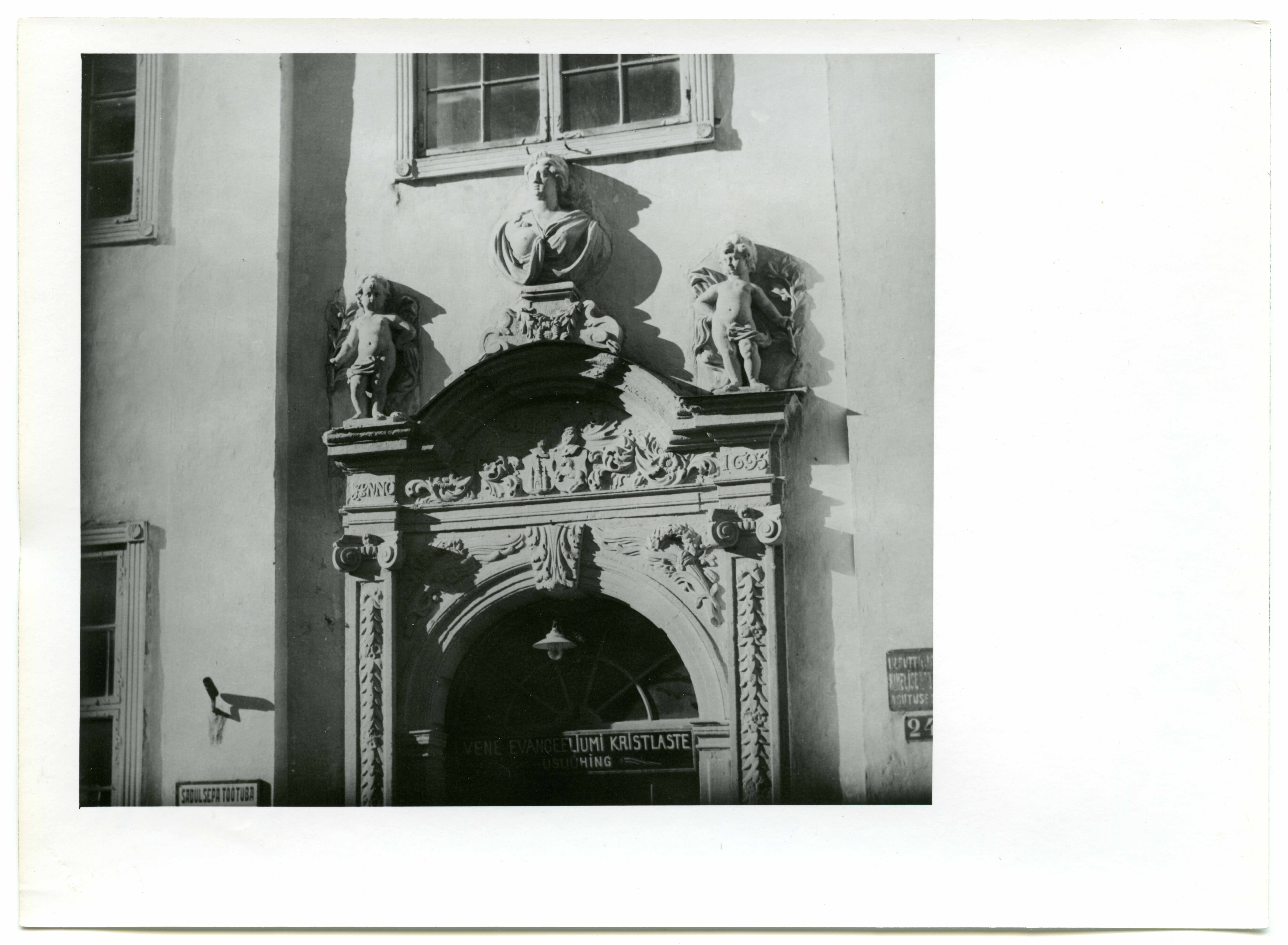 Narva. Rüütli tn 24, Hermann Poorteni maja portaali ülaosa (kujud) vaade küljelt. J. van der Capelle, 1695