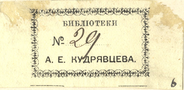 Nelinurkses ornamenteeritud raamistuses tekst: БИБЛIОТЕКИ / №... / А. Е. КУДРЯВЦЕВА.;"Иваск