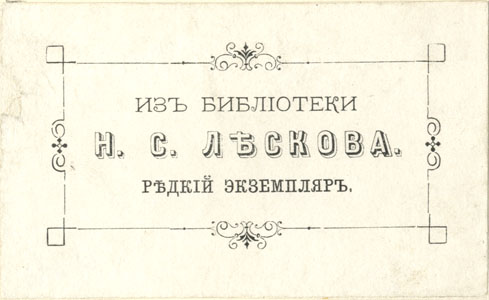 Nelinurkses ornamenteeritud raamistuses: ИЗЪ БИБЛIОТЕКИ / H.C. ЛѢСКОВА. / РѢДКIЙ ЭКСЕМПЛЯРЪ.