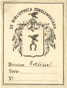 Nelinurkses raamistuses vapp. Joonises ülal: EX BIBLIOTHECA SOBOLEWSKIANA all: Division / Serie / №