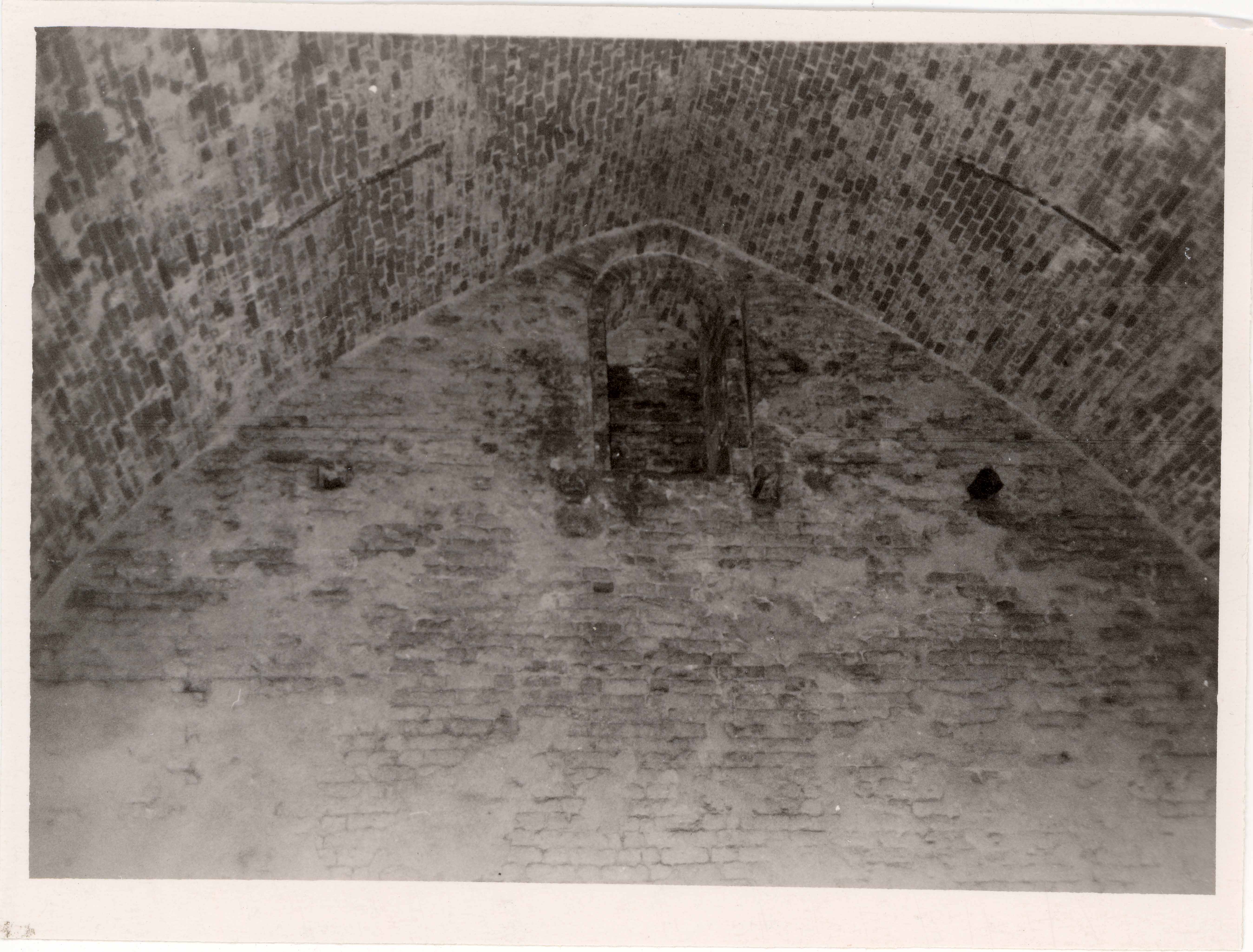 Tartu. Püssirohukeldri sisevaade. Peakeldri (saali) kinnimüüritud õhutuslõõr teravnurkse võlvlae S-poolses seinas