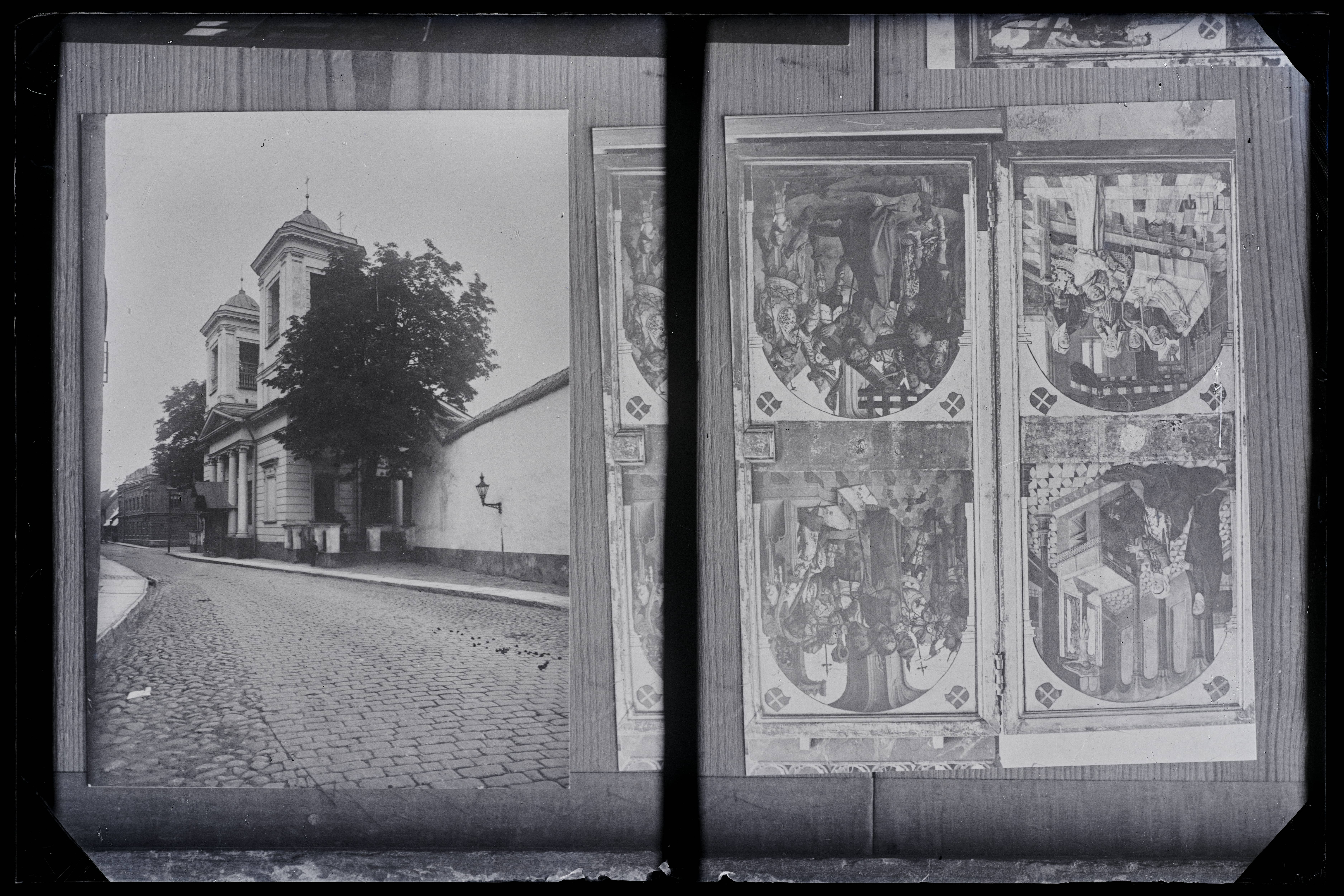 Tallinn. All-linn. 1. Pühavaimu kirik. Neli maali kappaltari vasakpoolse välistiiva siseküljel. Bernt Notke. 1483. 2. Vaade Nikolai kirikule Vene tn-lt S suunas