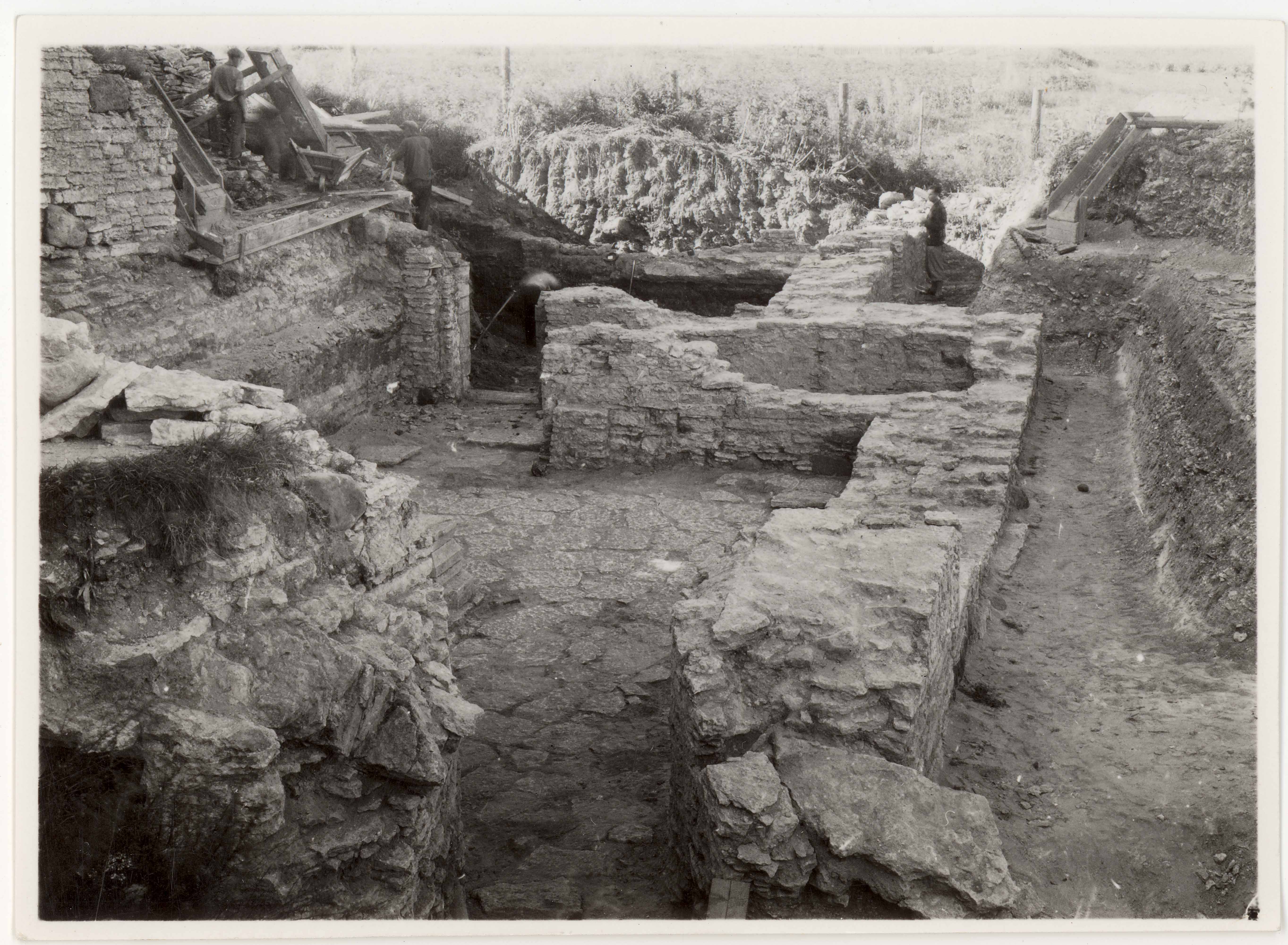 Pirita kloostri idaosa arheoloogilised uurimistööd. Üldvaade kesksambaga ruumile ja teistele sellest põhja pool paiknevatele ruumidele. Vaade loodesse