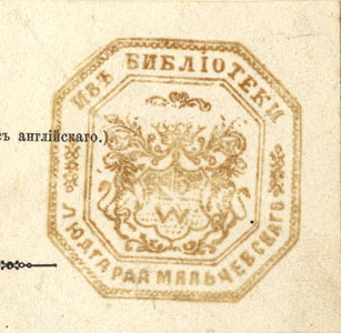 Kaheksanurkses raamistuses vapp. Joonises: ИЗЪ БИБЛİОТЕКИ / ЛЮДГАРДА МАЛЬЧЕВСКАГО