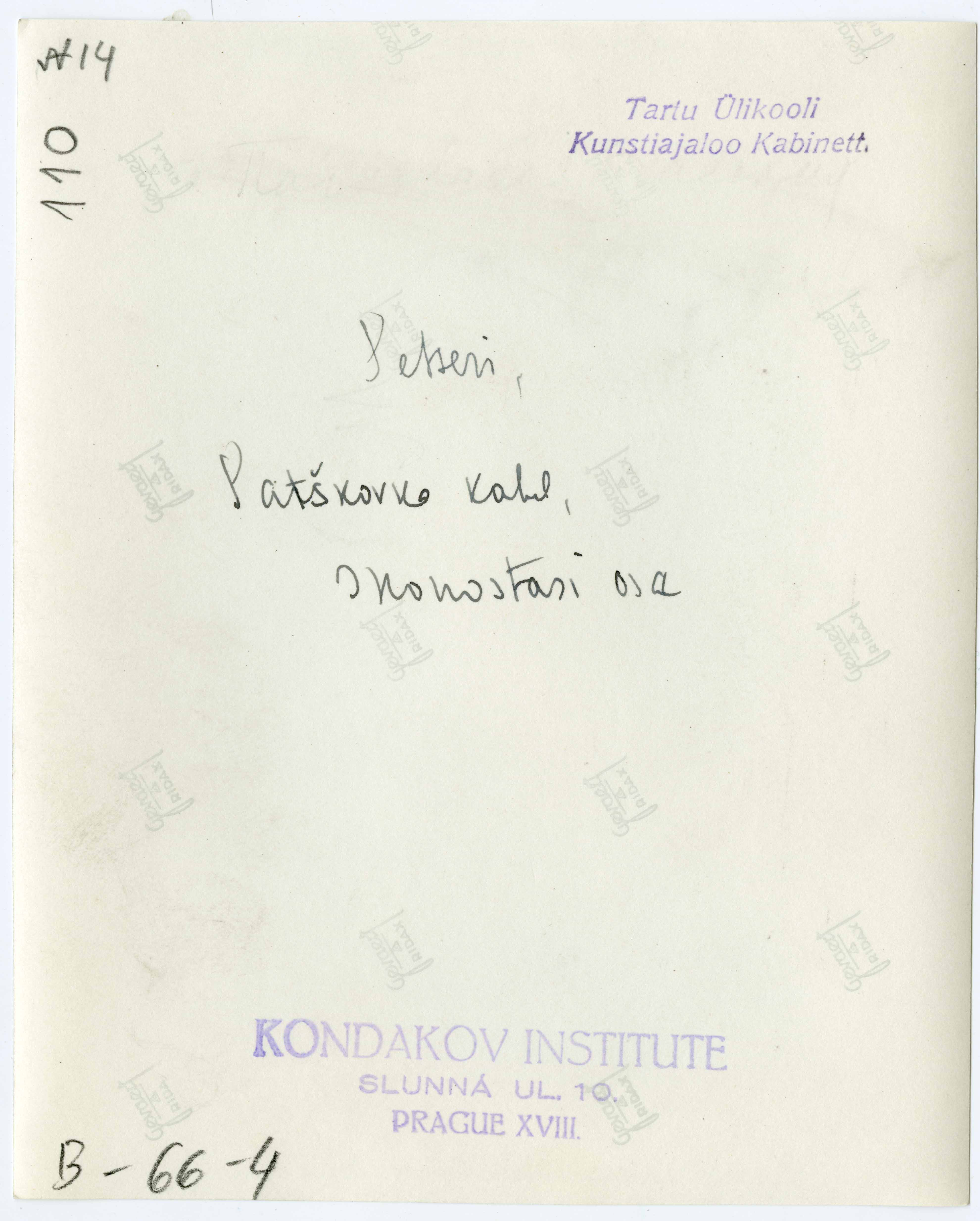 Tekst foto tagaküljel: Petseri, Patškovka kabel, Ikonostasi osa. Tempel: Kondakov; Kabinett