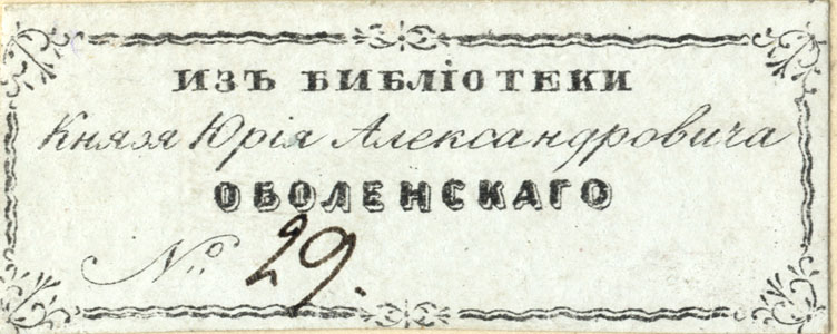 Nelinurkses ornamenteeritud raamistuses keskel: ИЗЪ БИБЛİОТЕКИ / Кназя Юрiя Александровича / ОБОЛЕНСКАГО / №