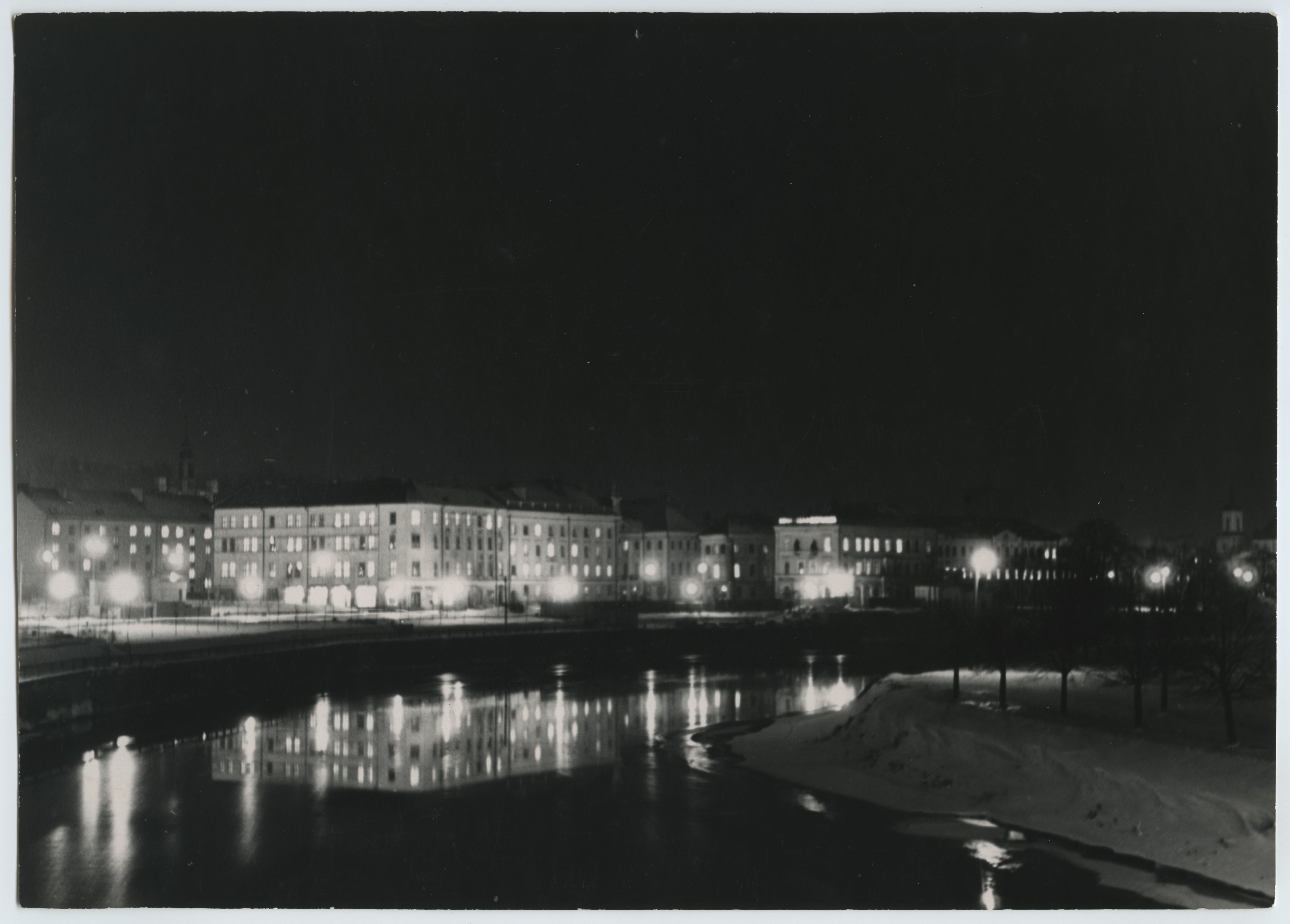 Tartu. Vaade kesklinnale üle Emajõe talvel pimedas