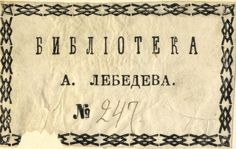Nelinurkses ornamenteeritud raamistuses keskel: БИБЛIОТЕКA / А. ЛЕБЕДЕВА. / №