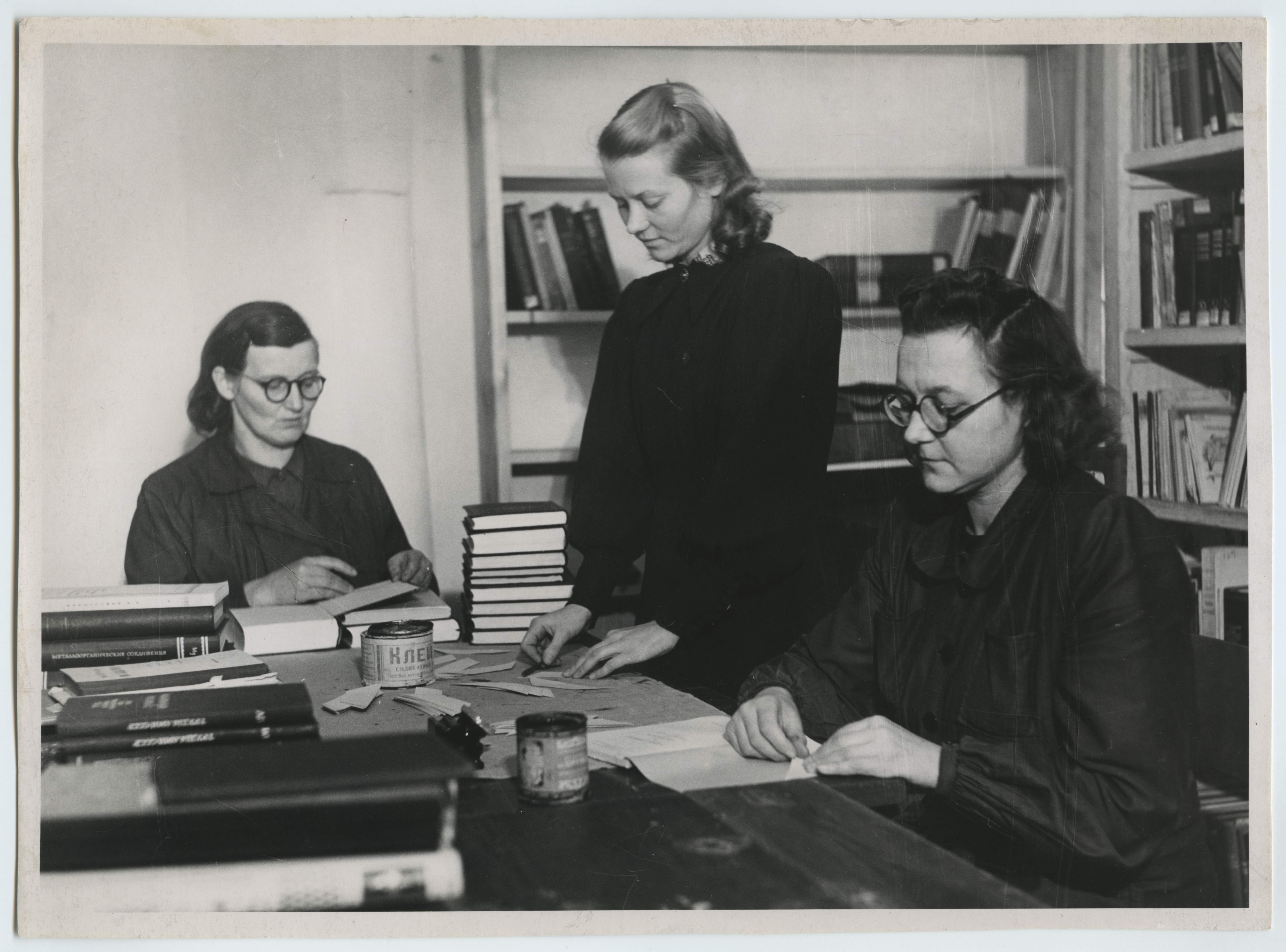 Tartu ülikooli raamatukogu eesrindlased (vasakult) Salme Sander, Linda Visberg ja Erna Ernits sotsialistlike kohustuste täitmisel 1952. a.