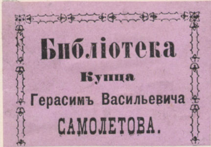 | dc.description | Nelinurkses ornamenteeritud raamistuses: Библiотека / Купца / Герасимъ Васильевича / САМОЛЕТОВА. | |