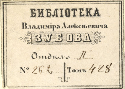 | dc.description | Nelinurkses raamistuses tekst: БИБЛIОТЕКA / Владимiра Алексѣевича / ЗУБОВА / Отдѣлъ... / №... Томъ... | |