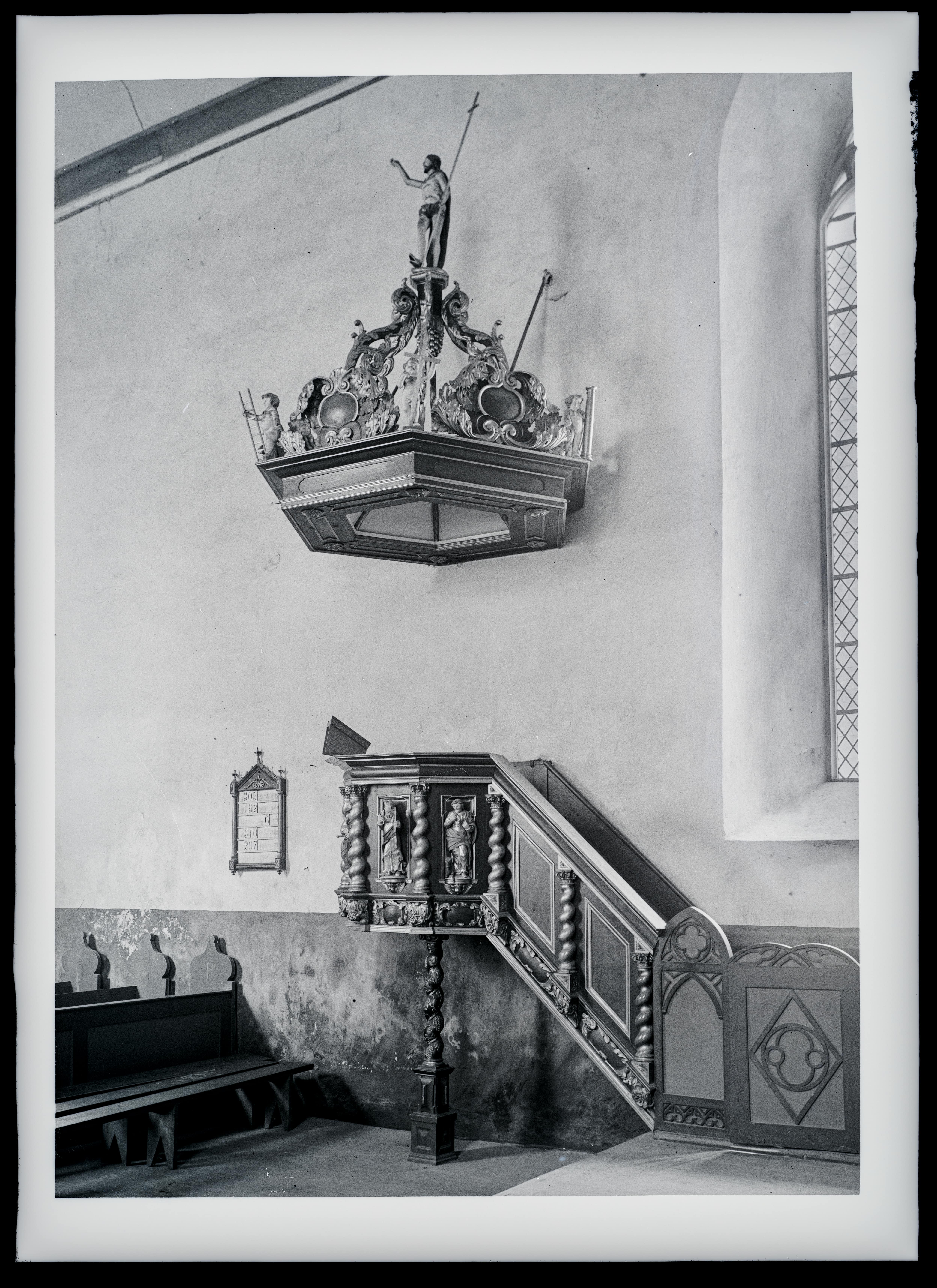 Vigala Maarja kirik. Vaade kantslile ja kõlaräästale kooriruumist loode suunas. Christian Ackermann. 1680.a.