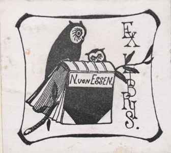 Kaks öökulli raamatu ja oksaga. Joonises keskel raamatu kaanel: N. VON ESSEN paremal: E / X / L / I / B / R / I / S.