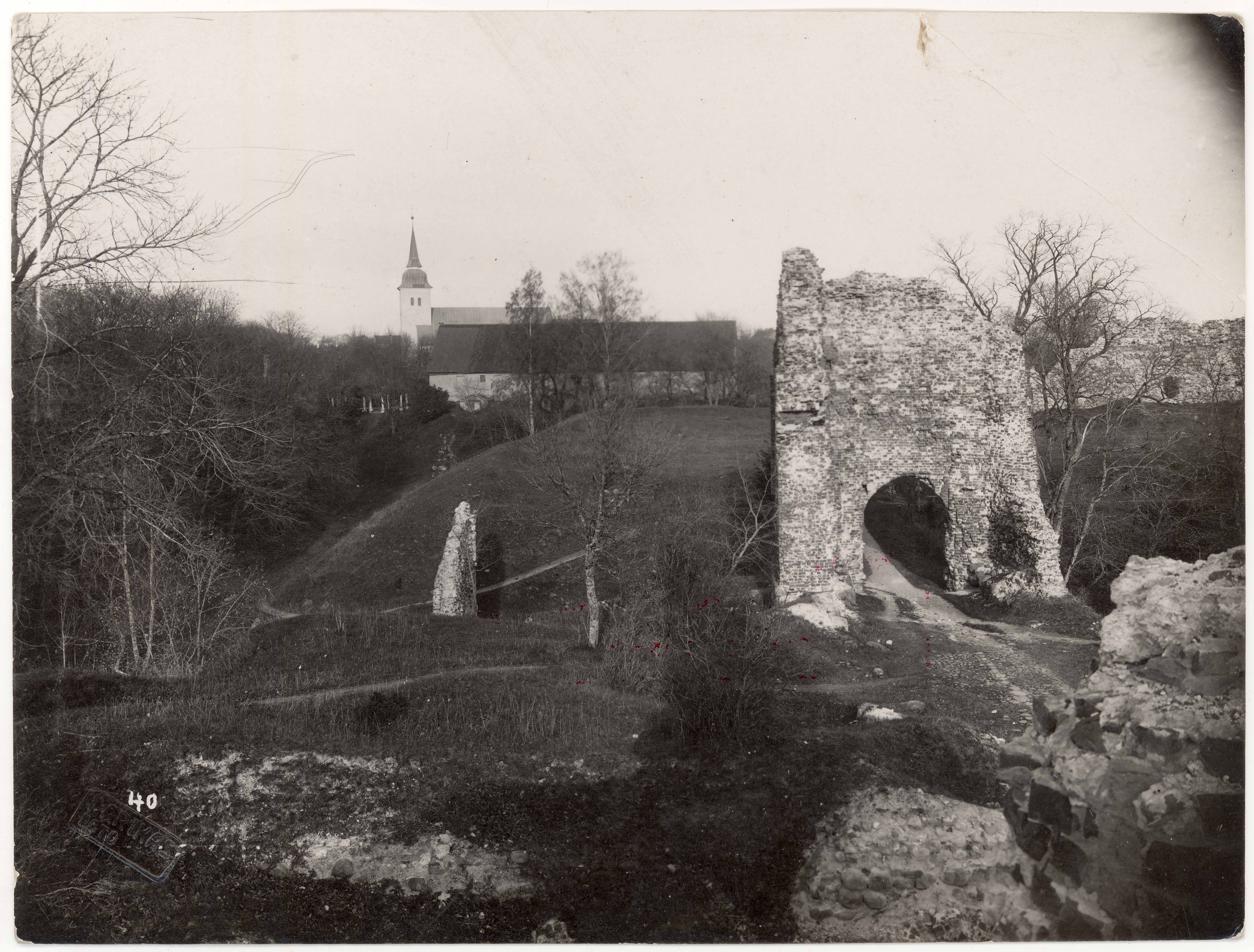 Viljandi pealinnuse varemed. N-värava ja Jaani kiriku vaade S-st