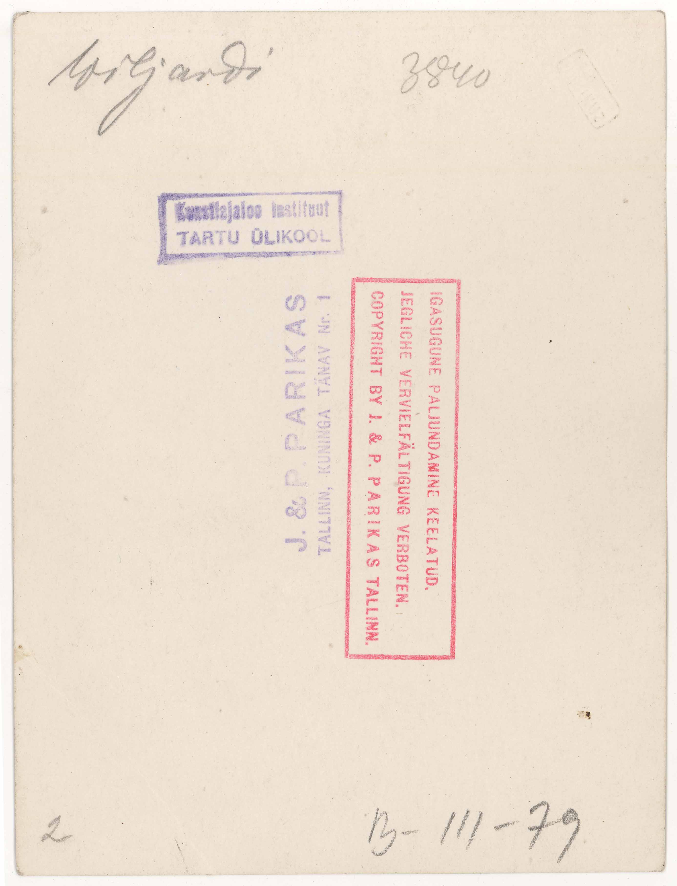 | dc.description | Tekst foto tagaküljel: Wiljandi 3840. Templid: Instituut; J&P | et |
