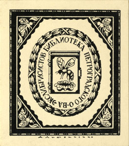 Nelinurkses ornamenteeritud raamistuses ovaalne vanik ja selles raamat, mille kaanel mesilane ja lilleõis. Joonise all keskel signeering: А. Литвиненко keskel ovaalis: БИБЛIОТЕКИ ПЕТРОГРАДСКОГО О-ВА ЕКСЛИБРИСИСТОВ