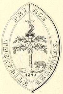 Mandlikujulises raamis Gagarinite vapielemendid puu, mõõka hoidev käsi, karu ja kroon. Joonises ümber raamistuse: PRINCE THEOPHILE GAGARINE. all keskel: 1845