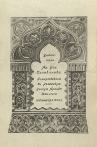 Ukseava kujutav ornamentaalne raamistus. Joonises keskel: Библiо- / тека / Ал. Вас. / Селиванова. / Пожертвована / въ Рязанскую / Ученую Архивн. / Комиссiю / 10 Октября 1893 г.;"Иваск
