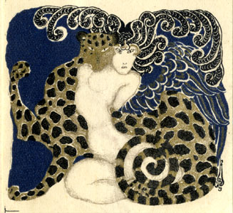 Sulgedega ehitud peakattega naisakt ja leopard