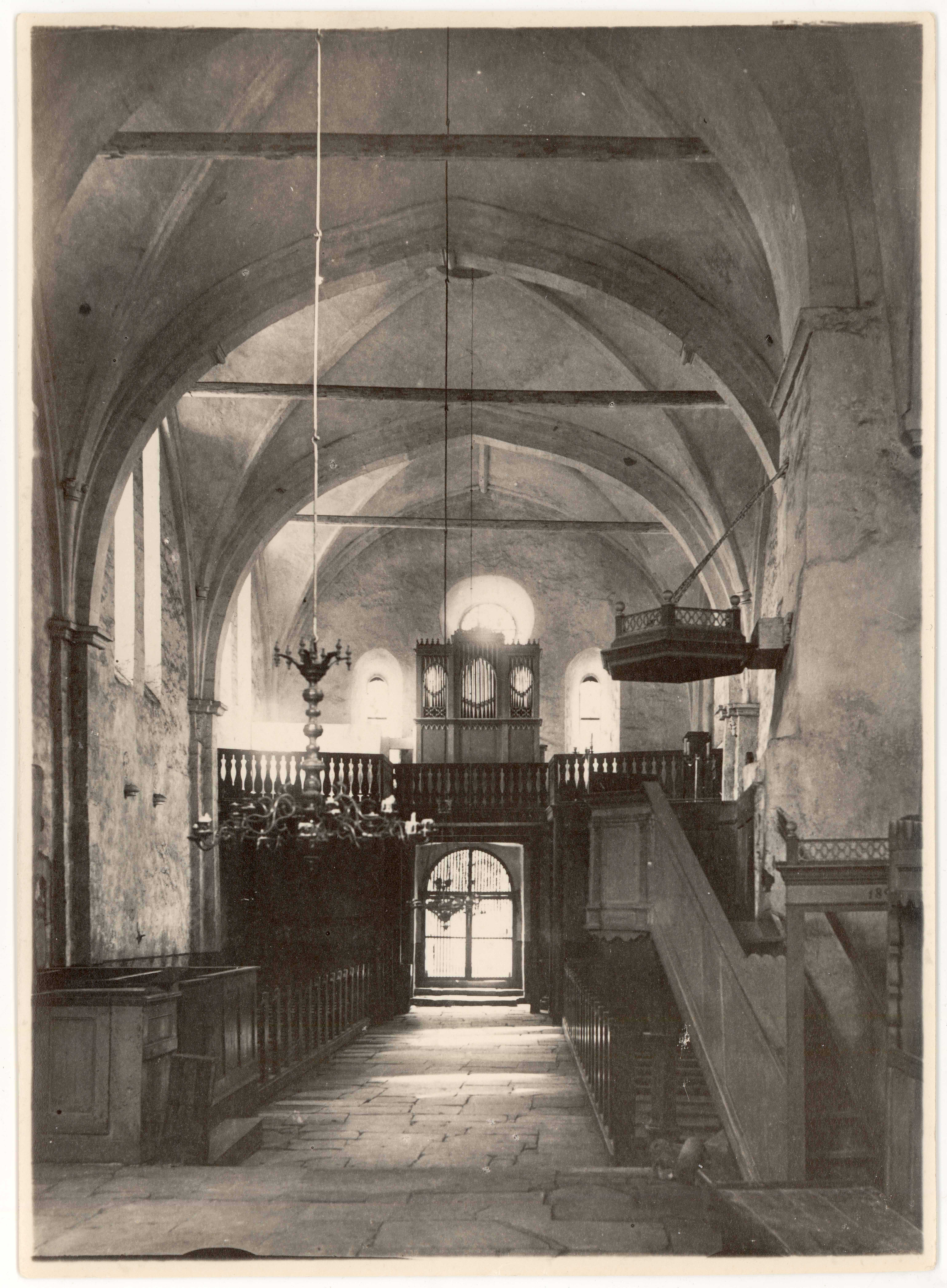 Tekst negatiivi ümbrikul: Valjala. Vaade altariruumist löövi. Foto Arro 1924. Templid: Instituut