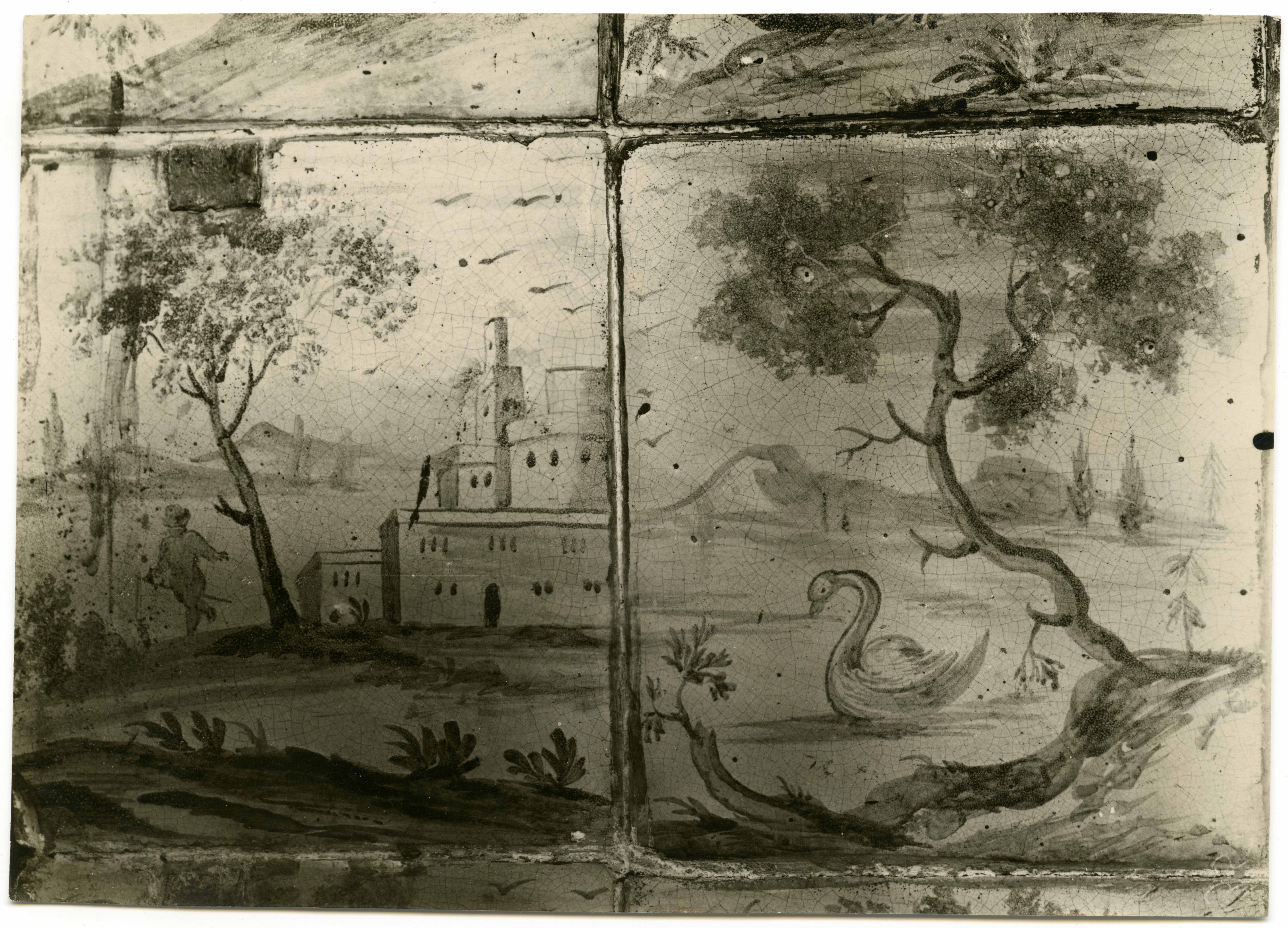 Narva. Eha tn 2. Kahhelahi (17. saj). Detail. Luik maastiku taustal