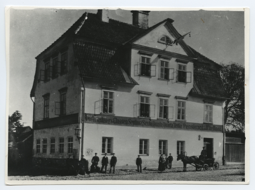 Tartu. Treffneri gümnaasiumi hoone Hobuse ja Kalda tänava nurgal