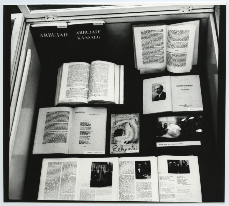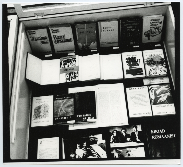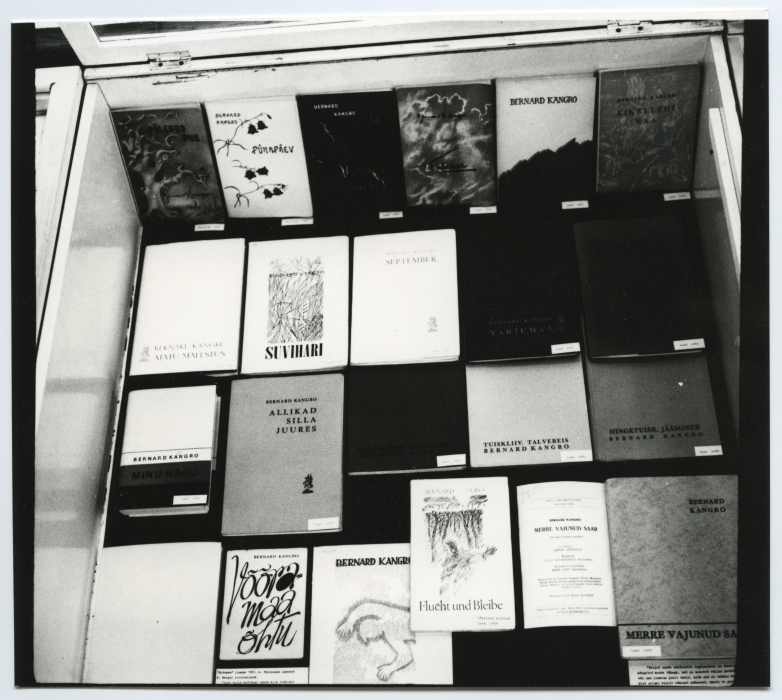 Bernard Kangro 80. sünnipäevale pühendatud näitus Tartu ülikooli raamatukogus konverentsisaali ees