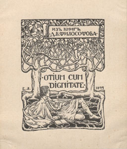 Kahe puu all lamav mees raamatuga. Joonises keskel vasakul signeering: Е.Л. keskel paremal: 1899 ülal lindil: ИЗЪ КНИГЪ / Д. В. ФИЛОСОФОВА. keskel: OTIUM CUM / DIGNITATE;"Иваск