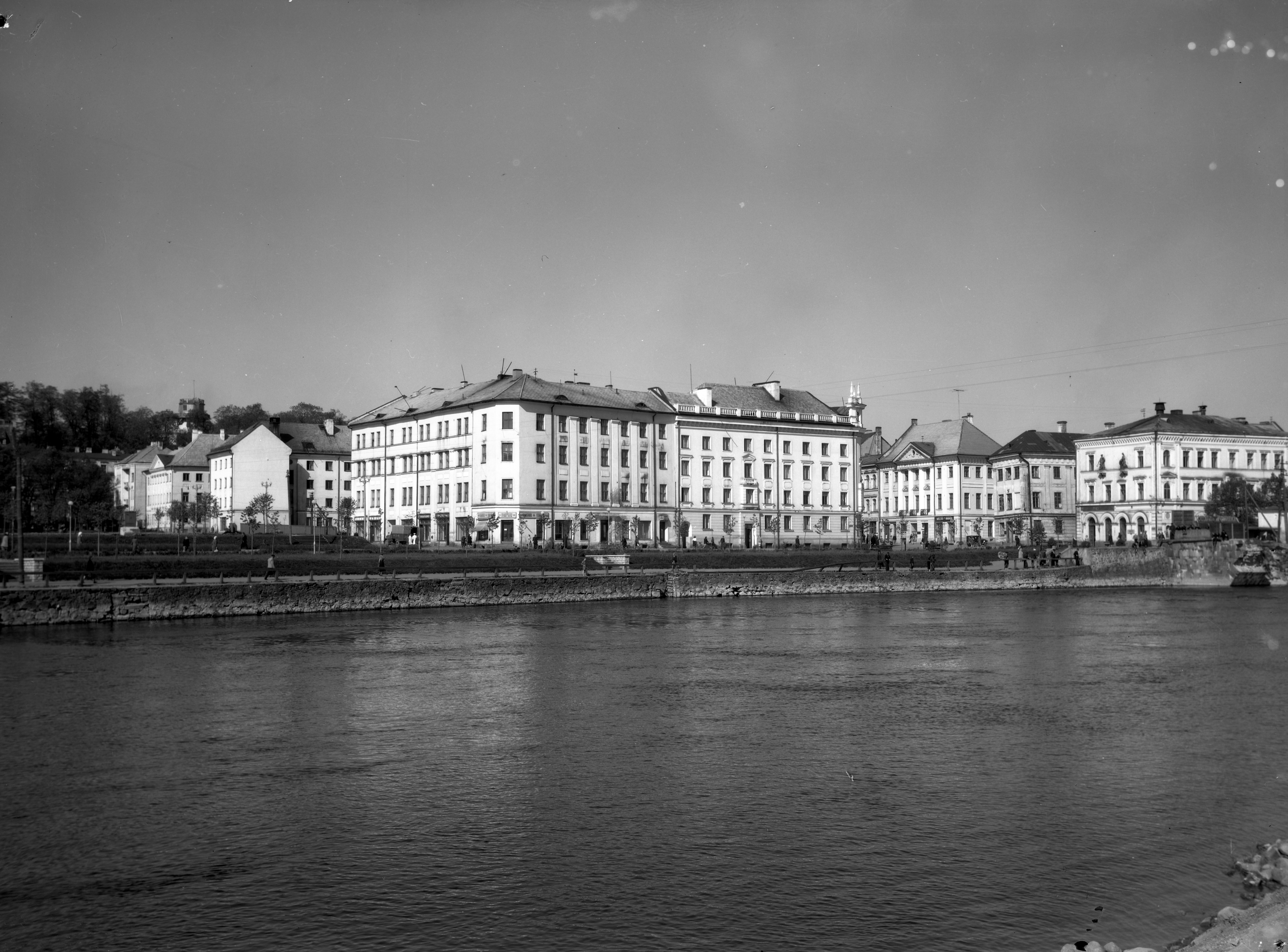 Tartu. Vaade Vabaduse pst ja Poe tänava nurgal ning Raekoja platsi alguses paiknevatele majadele üle Emajõe W suunas