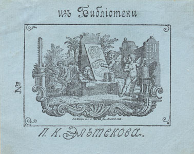 Nelinurkses raamistuses stseen nelja putoga. Joonises all: J.C. Philips inv. et fec. Amsterd. 1748. plaadil ülal: изъ Библiотеки all: П. К. ЭЛЬТЕКОВА. vasakul keskel: №;"Eksliibris on valmistatud J.C. Philipsi gravüüri (1748) järgi