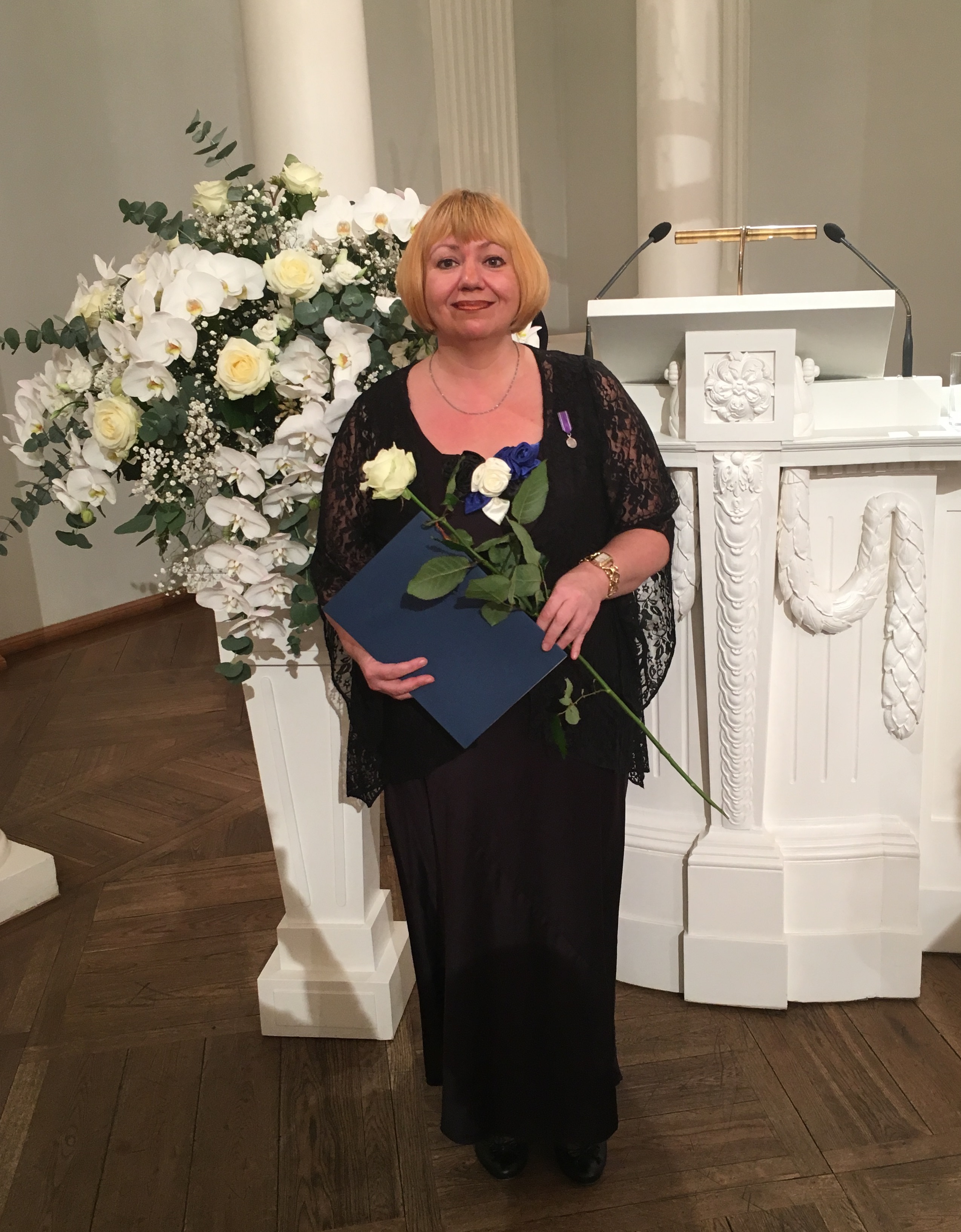 Olga Einasto Tartu Ülikooli aulas rahvusülikooli 97. aastapäeva aktusel doktoridiplomiga (PhD)