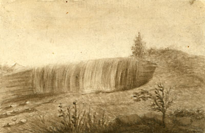 Eesti, Harjumaa, Jägala juga, kohavaated, maastikud, baltisaksa, kunst, joonistus, seepia (kunst), 19. saj.