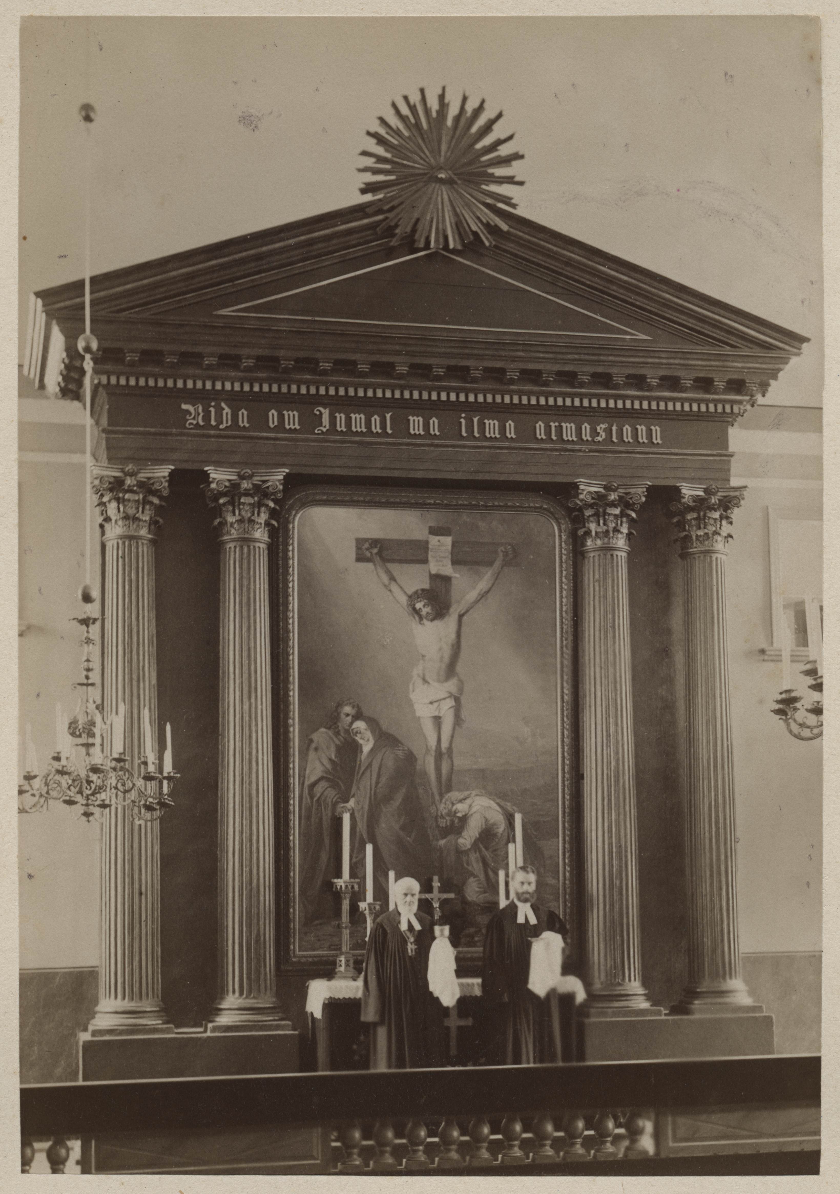Altaris kaks vaimulikku armulauariistadega: ühel käes karikas, teisel taldrik