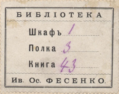 Nelinurkses raamistuses all: Ив. Ос. ФЕСЕНКО. ülal: БИБЛIОТЕКА keskel: Шкафъ... / Полка... / Книга...